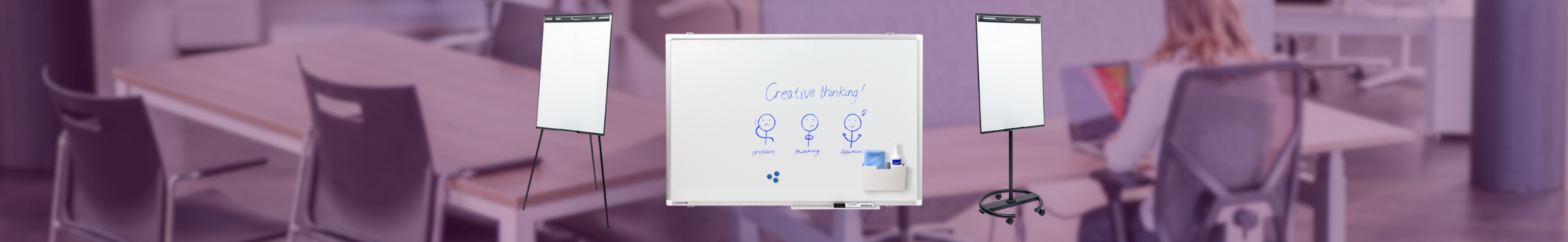 Des produits pratiques pour présenter et soutenir le travail. Pensez aux tableaux blancs, aux écrans et aux accessoires de bureau. Utiles pour les réunions et l'usage quotidien.