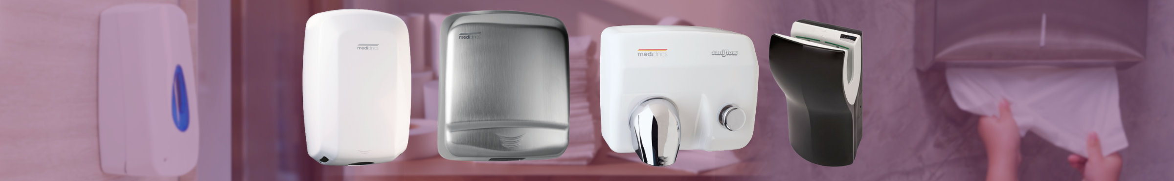Sèche-mains pour les salles de bains et les toilettes publiques. Conçus pour un séchage rapide et hygiénique des mains. Idéal pour un usage professionnel.